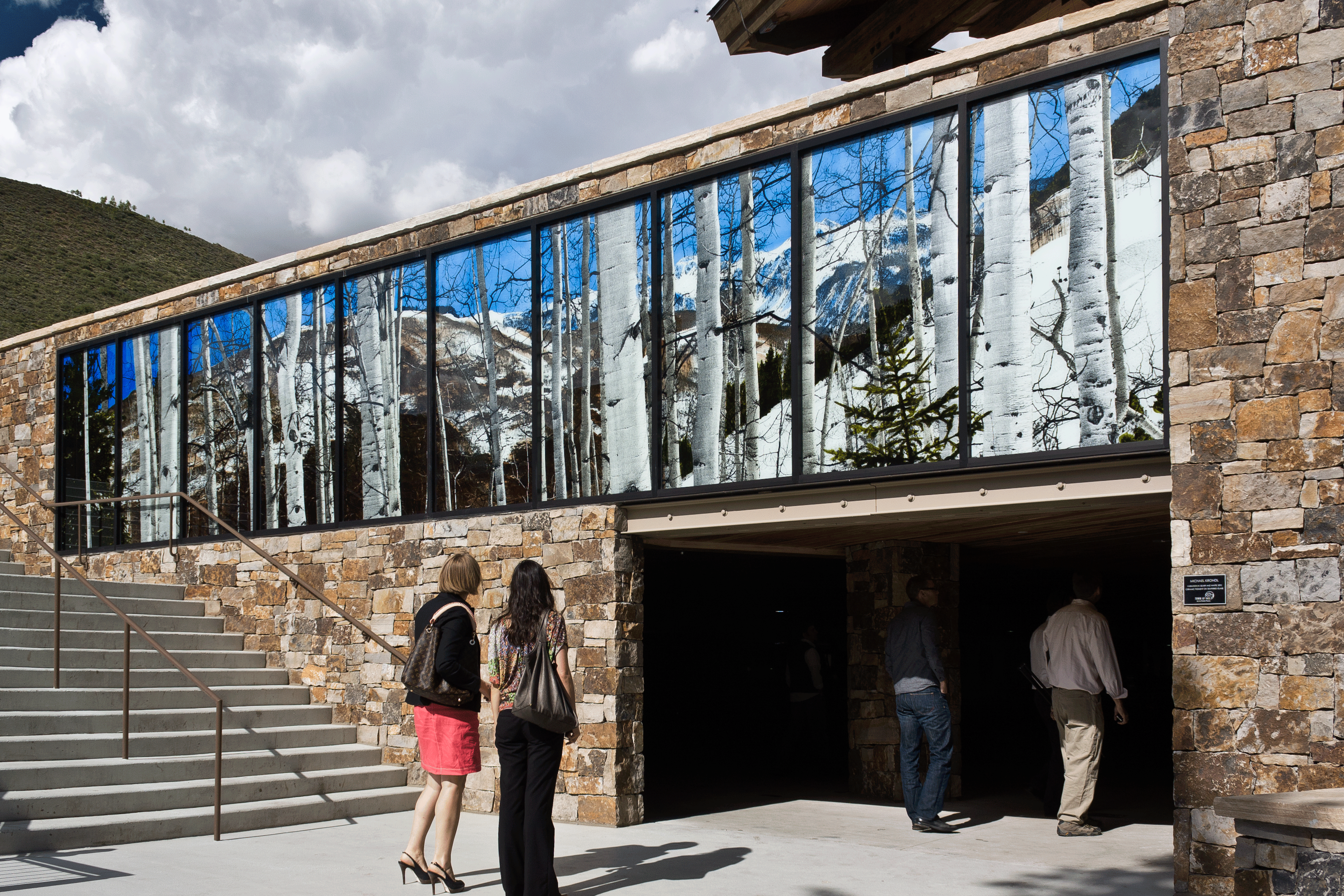 Variation in Silver and White is a permanent installation in Vail, CO. The image is a photographic rendering the Gore Range as seen through a scrim of aspen trees. It represents an approximation of the view that is blocked by the buildings, in essence erasing or creating a virtual window through the building where it is installed. The piece was commissioned by the Town of Vail.